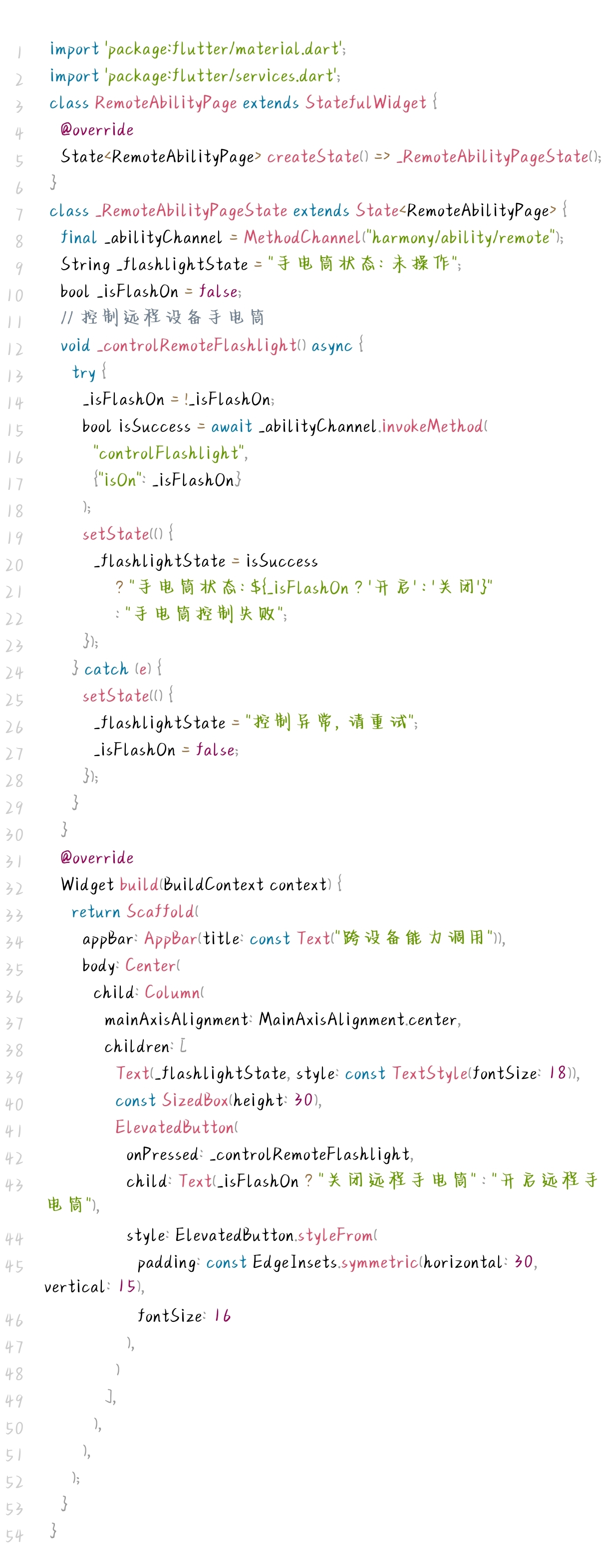 实现跨设备调用简单硬件能力,以远程设备手电筒控制为例,通过本地Flutter界面触发指令,控制其他鸿蒙设备的手电筒开关,展现分布式能力共享的便捷性。