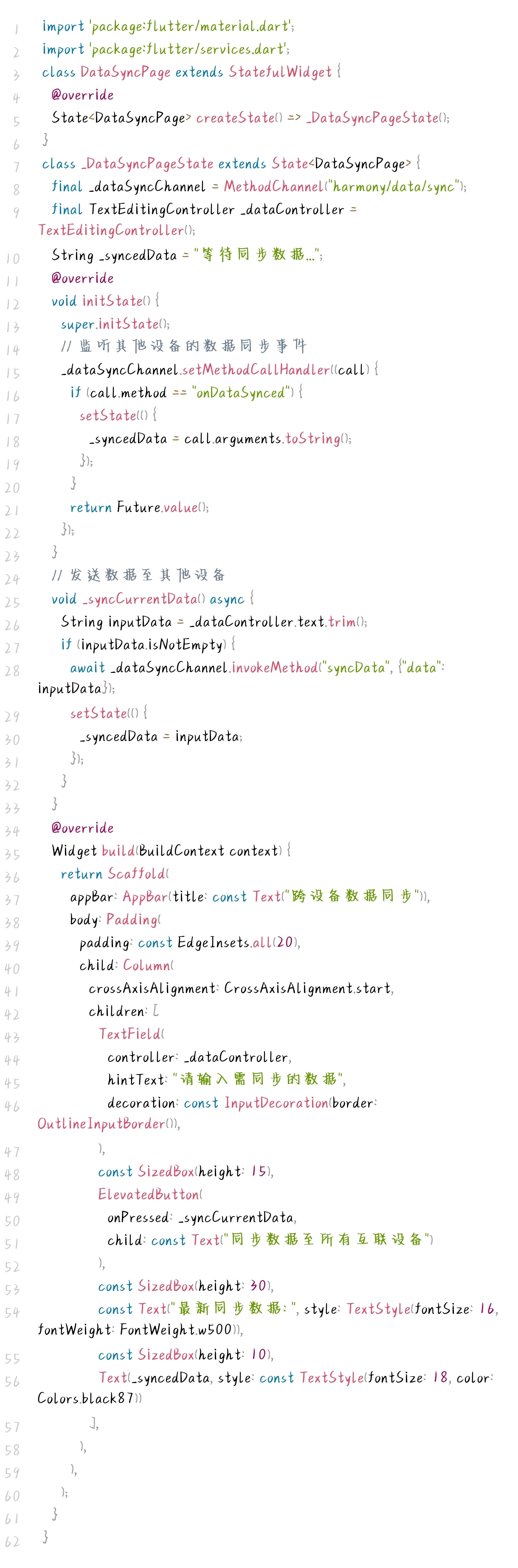 鸿蒙原生端借助DistributedDataManager构建分布式数据存储节点,接收Flutter端传入的数据后,同步推送至所有互联设备;Flutter端既支持主动发送同步数据,也能实时监听数据变化,实现多设备数据无缝联动,代码精简且无冗余逻辑。