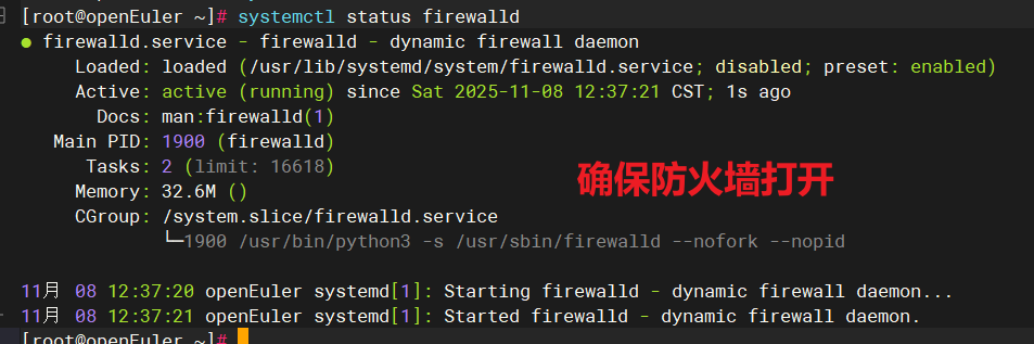 openEuler 内置 firewalld,简化了防火墙管理,适用于多种网络场景。