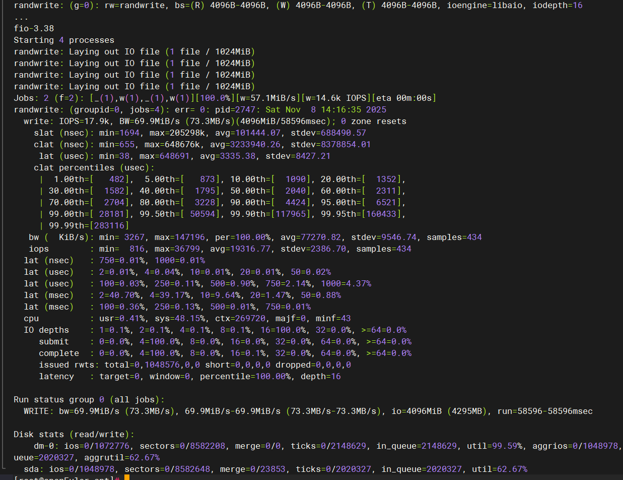 | 带宽 (MiB/s) | 69.9 MiB/s | 73.3 MB/s | 每秒写入 69.9 MiB 数据 |