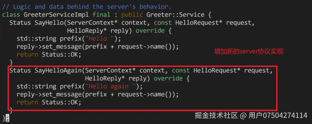 在grpc仓库目录下,编辑examples/cpp/helloworld/greeter_server.cc: