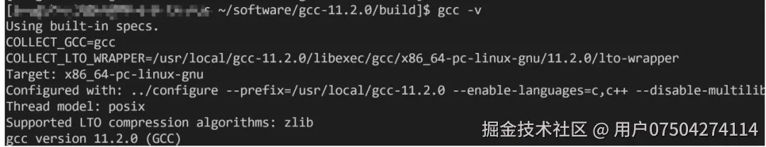 执行完毕执行,可以执行 gcc -v 进行检查。可以发现已经变成了gcc 11.2。