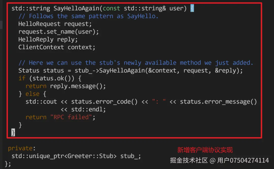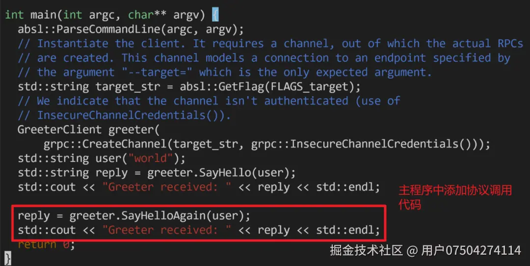 在grpc仓库目录下,编辑examples/cpp/helloworld/greeter_client.cc: