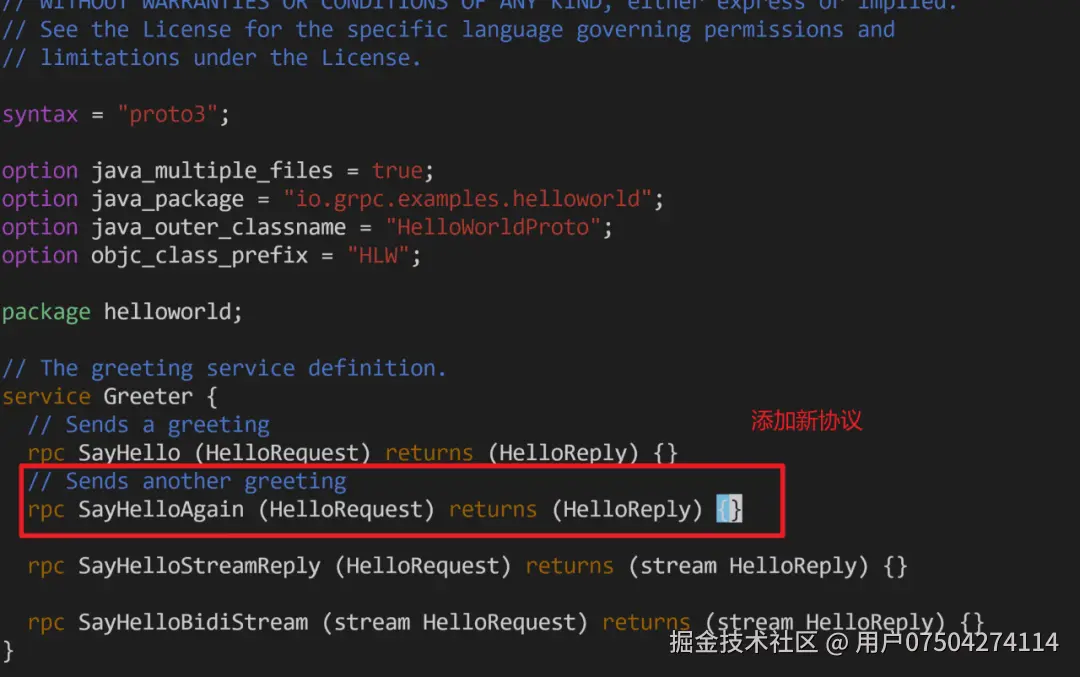 在grpc仓库目录下,编辑 examples/protos/helloworld.proto ,增加 SayHelloAgain() 协议。