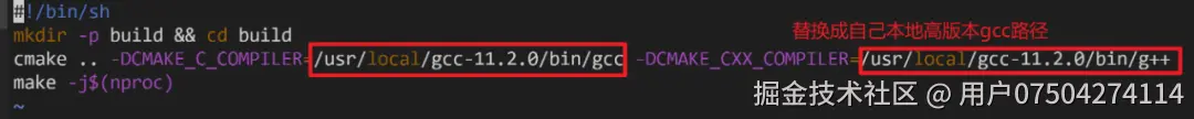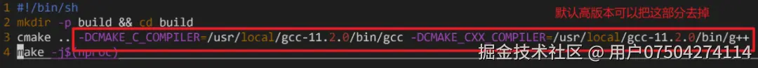 如果默认gcc就是高版本,可以将CMake指令中指定版本的部分删除