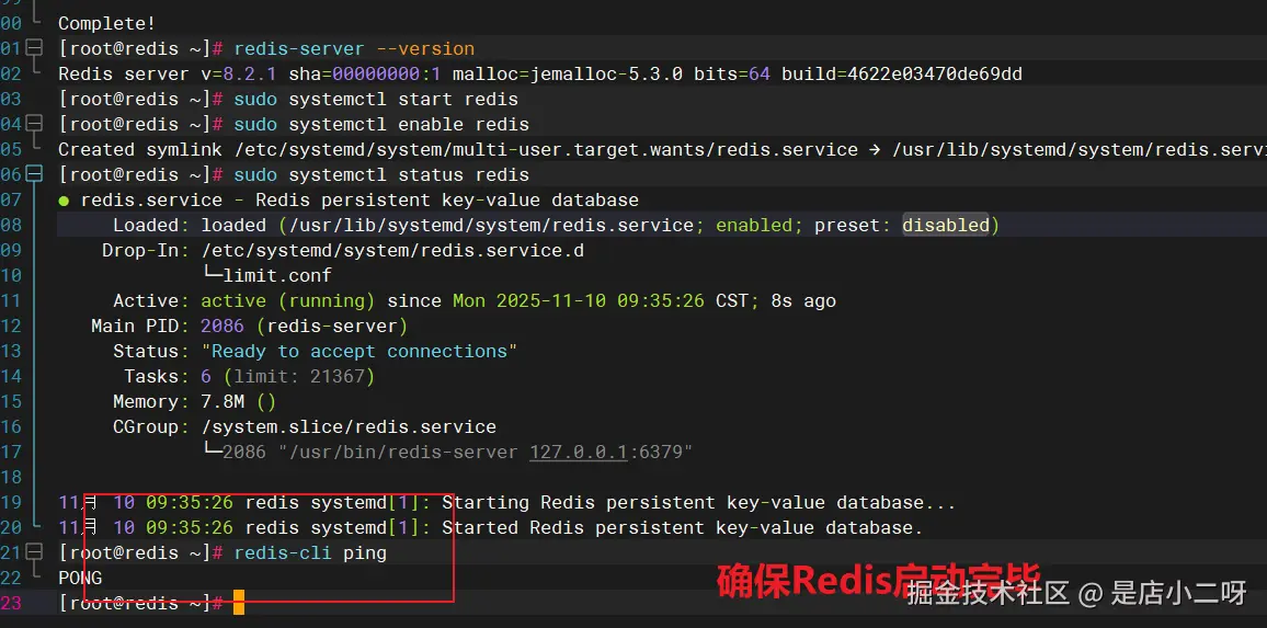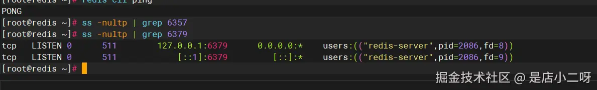 如果返回 PONG,说明 Redis 已成功启动。此时 Redis 运行在默认配置下,监听 6379 端口。