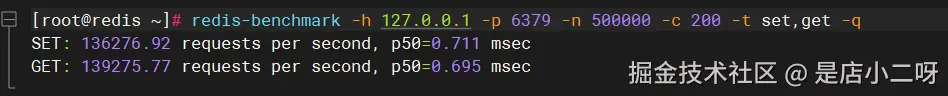 redis-benchmark -h 127.0.0.1 -p 6379 -n 500000 -c 200 -t set,get -q