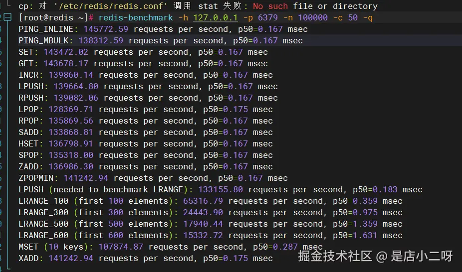 redis-benchmark 是 Redis 官方提供的性能测试工具,可以全面评估 Redis 的读写性能。我们首先在默认配置下进行基准测试: