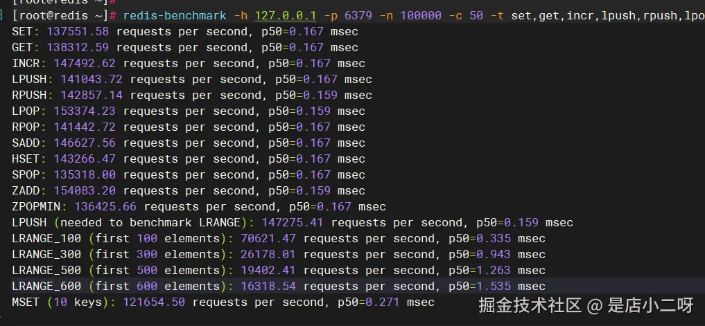redis-benchmark -h 127.0.0.1 -p 6379 -n 100000 -c 50 -t set,get,incr,lpush,rpush,lpop,rpop,sadd,hset,spop,zadd,zpopmin,lrange,mset -q