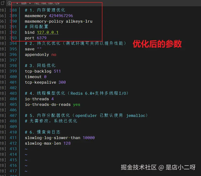 基于 openEuler 的系统特性,我们对 Redis 配置进行针对性优化。编辑配置文件: