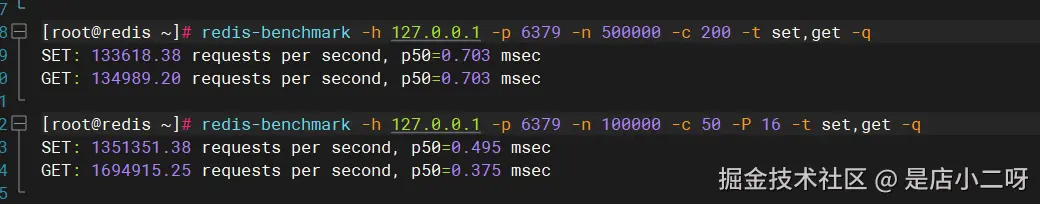 redis-benchmark -h 127.0.0.1 -p 6379 -n 100000 -c 50 -P 16 -t set,get -q