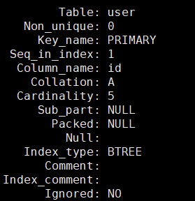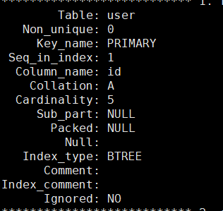 这里我们能查看一张表的全部全索引情况。虽然我们没有主动的添加索引,但是innodb会自动按照主键为我们建立索引结构如图索引名称为:PRIMARY即主键索引,索引结构是BTREE就是b+树。