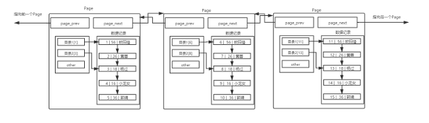 这是单个page的示意图,内部通过链表方式将每一条数据按照主键进行排序和连接,当我们查找数据时就是找到对应的page然后遍历查找数据就可以。