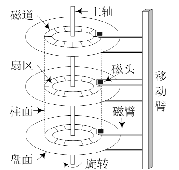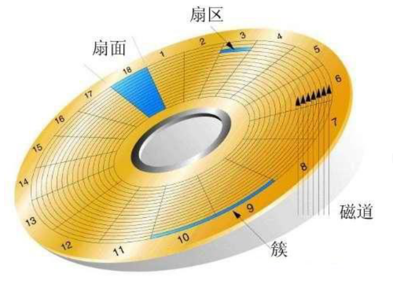 磁盘每个扇区一般为512字节(每次读取四个扇区的数据)或4KB,同半径的扇区组成的称为磁道,同一列中不同半径的扇区称为扇面。整个磁盘不止一片磁盘,而是由很多磁盘堆叠而成