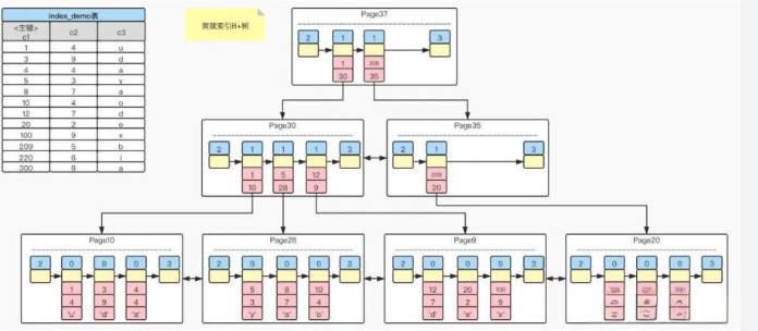 这个B+树我们可以将其理解为目录的目录,当page十分多的时候我们就可以对page也进行如同内部管理数据一样,对page也进行目录摘取。用一个page专门负责存储page中的数据存放的信息。如第一个page存放的数据的主键值为1~20,那么在目录page中我们只需要记录这个page对应的主键值的起始号和指向其的指针作为一条数据存放在目录page中,只要查找的数据的主键值不在此范围中我们一次就能过滤掉一个page,这可以大大提升效率。