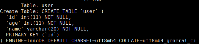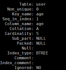 再来查看索引时我们能看到,表中是多了一个索引,索引名是:age 索引结构也是BTREE。