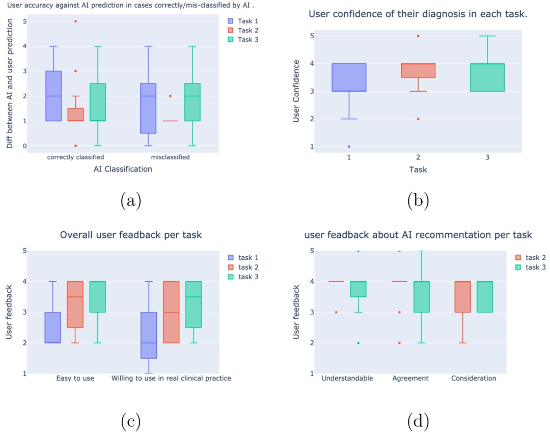 Fig. 7. Box plots of human behavior metrics analyzed in the user study. (a) Pathologists' accuracy and confidence in predicting GEP classes. (b) Pathologists' overallconfidence of each task. (c) Pathologists' feedback about "whether the interface is easy to use?" and "Whether they are willing to use the interface in real clinicalpractice?". (d) Pathologists' feedback on AI recommendations, which includes "Whether the AI recommendation is understandable?"; "Whether pathologists agreewith AI recommendation?"; and "Whether pathologists consider AI recommendation in final diagnosis?".