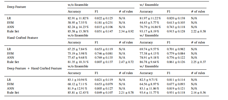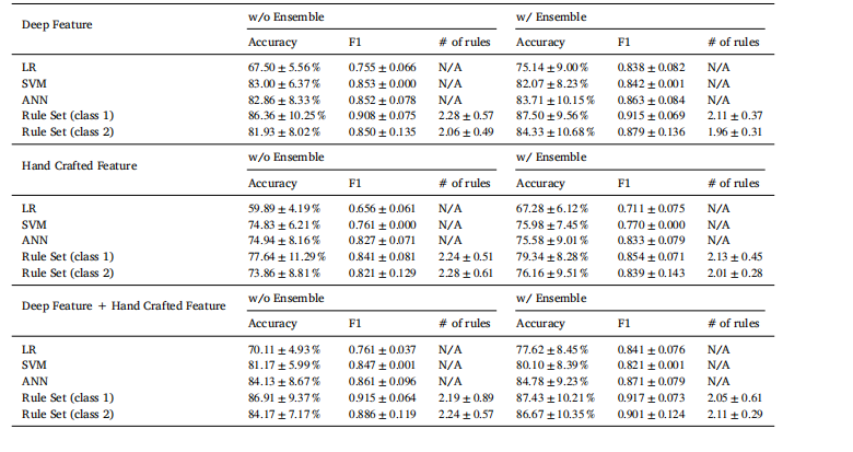 Table 1Ablation study of explainable classification with different methods and an ensemble technique for UM dataset. LR refers to logisticregression. Rule Set (class 𝑘, 𝑘 = 1, 2) refers to results using the embedding created from class 𝑘 slides. "Deep Feature" refers tousing UMAP projection created by cell-level deep features; "Hand Crafted Feature" refers to using UMAP projection created byhand-crafted features; "Deep Feature + Hand Crafted Feature" refers to using UMAP projection created by the concatenation ofcell-level deep features and hand-crafted features.