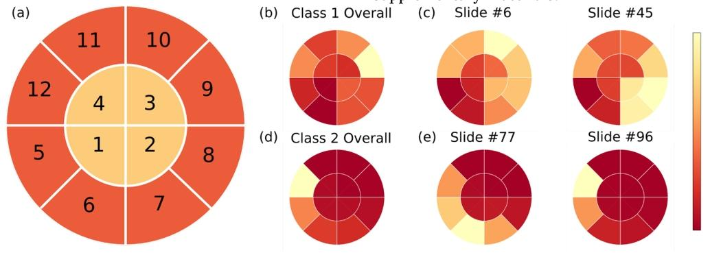 Fig. 3. (a) The definition of spatial partitioning and density charts in the distorted 2D embedding space. (b) The density chart of all cells in GEP class 1; (c) Twodensity chart examples of GEP class 1 slides; (d) The density chart of all cells in GEP class 2; (e) Two density chart examples of GEP class 2 slides.