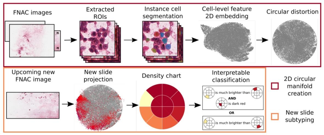 Fig. 1. System overview of the proposed method. Cell-level features are obtained by aggregation over instance cell segmentation masks and then embedded intoa 2D space. Several slides are embedded in this way to create a representative cell appearance space, and the 2D embedding space is subsequently distorted into acircle. For every other cytopathology image, cell representations are extracted and projected with the same embedding process into the circular space (red pointsin the second image of the second column), such that one density chart is generated for every slide. Finally, we find an explainable rule set to classify UM biopsiesbased on the density charts.