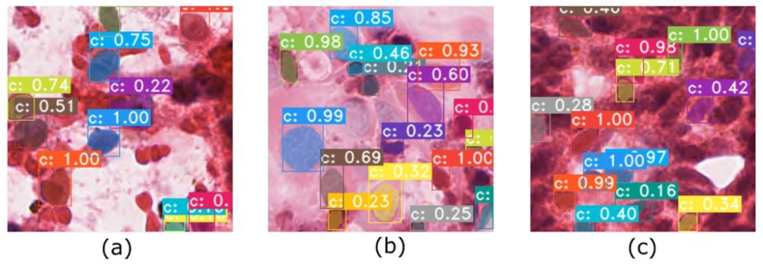 图 6 分割结果示例。分割网络能够:(a) 将癌细胞(紫色,较大)与血细胞(红色,较小)区分开;(b) 分割不同大小的细胞,但 (c) 会遗漏部分模糊细胞。框内数字为置信度分数。