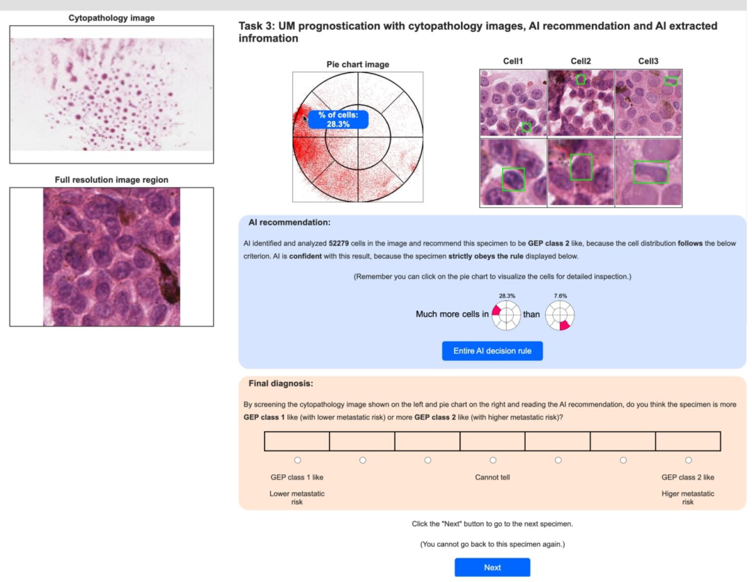 图 5 含癌症亚型预测解释的用户界面。用户需在基于细胞形态构成的人工智能(AI)预测辅助下完成癌症亚型分类。细胞构成通过饼图可视化呈现,用户可点击饼图任意区域查看对应细胞形态。界面同时展示AI预测结果及基于规则集标准的支撑依据。