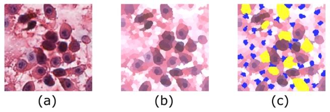 Fig. 2. The ROI annotation procedure. (a) the extracted high-quality ROI; (b)the generated super-pixels.; (c) the annotations on super-pixels. Yellow and blueregions are annotated super-pixels for cancer cells nd background, respectively