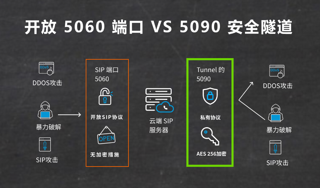 ●路由电话机的防御: 路由电话机将所有分散的 SIP 流量整合到两个、经过身份验证的加密隧道中(通常是 5090 端口)。这意味着云 PBX 服务器无需向公网暴露传统的 SIP 端口(5060)来处理分散的远程分机,甚至可以将 5060 端口对公网关闭,仅保留对SIP运营商特定IP的端口开放。
