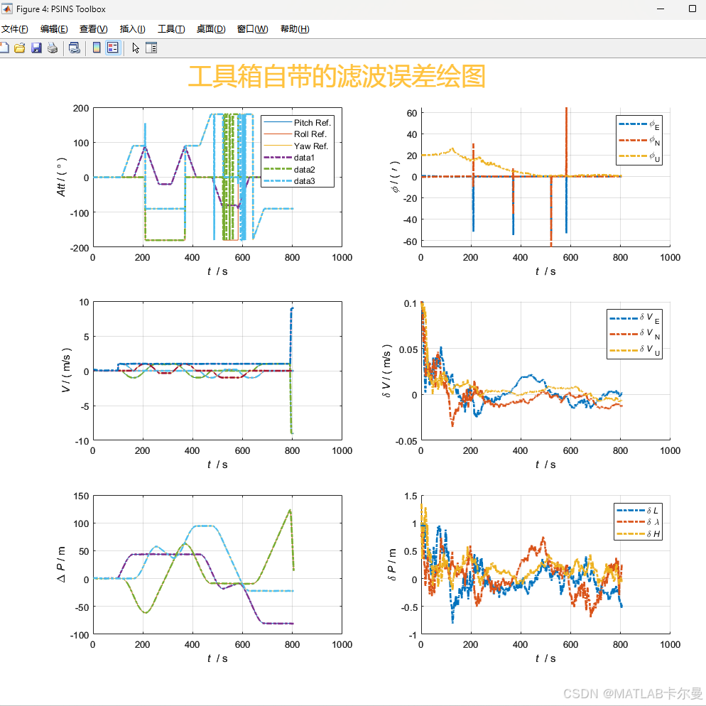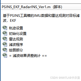 本程序利用 P S I N S PSINS PSINS工具箱构建一个三维机动轨迹,并模拟 I M U IMU IMU与雷达观测数据,用于演示扩展卡尔曼滤波(EKF)在惯导与外部传感器融合中的具体实现流程。