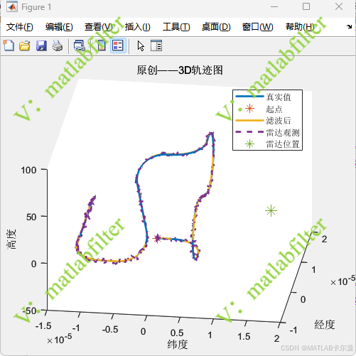 基于 PSINS工具箱【需提前安装,工具箱开源】的运动建模与滤波,实现 IMU 与雷达观测融合的扩展卡尔曼滤波(EKF)示例。利用PSINS的轨迹生成模块构造三维机动轨迹,并按设定的加速度、转弯、爬升/下降段生成真实 AVP(姿态-速度-位置)序列。随后给 IMU 数据加入安装误差、随机漂移和噪声,形成带误差的惯导数据,并通过 insupdate 完成惯导解算。