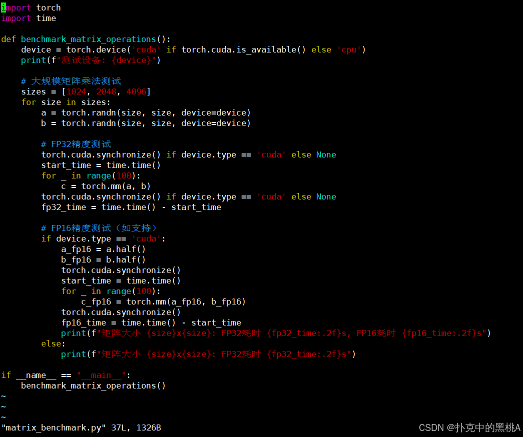 矩阵运算是深度学习的基础操作,我们使用PyTorch进行FP32和FP16精度下的性能对比: