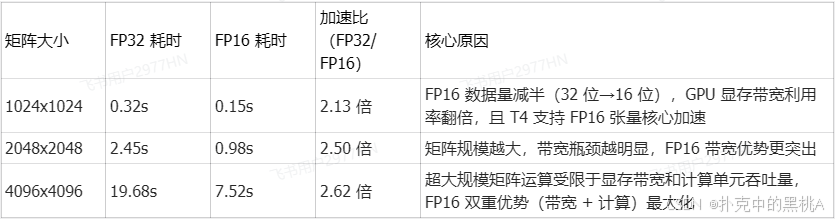 print(f"矩阵大小 {size}x{size}: FP32耗时 {fp32_time:.2f}s, FP16耗时 {fp16_time:.2f}s")