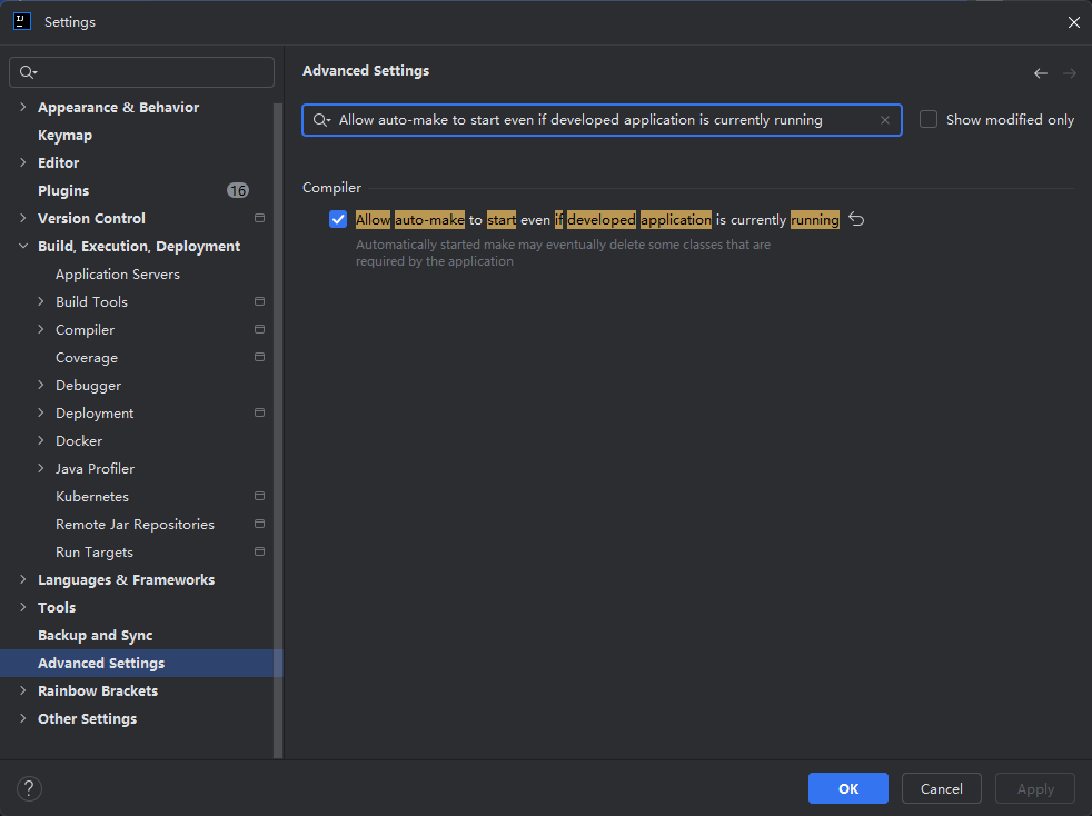 Settings → Advanced Settings 在搜索框输入Allow auto-make to start even if developed application is currently running 然后勾选复选框