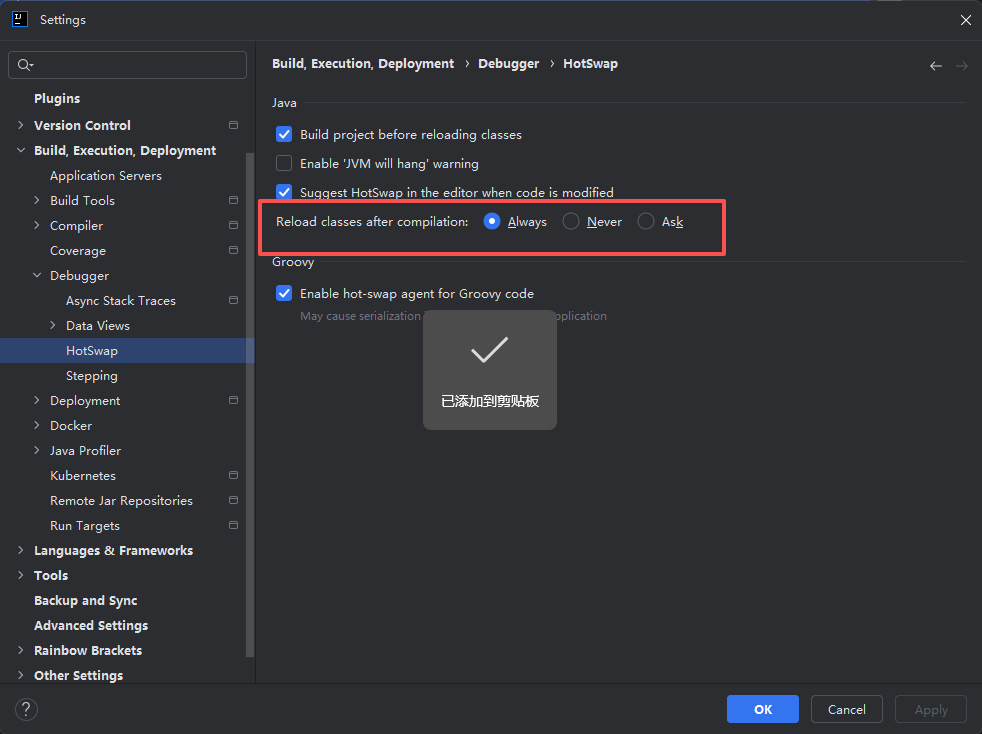 此时热部署已经生效,但是还有一个问题 修改代码之后CTRL+F9还是会冷启动 此处需要设置 HotSwap:Settings → Build, Execution, Deployment → Debugger → HotSwap中Reload classes after compilation 选择Always