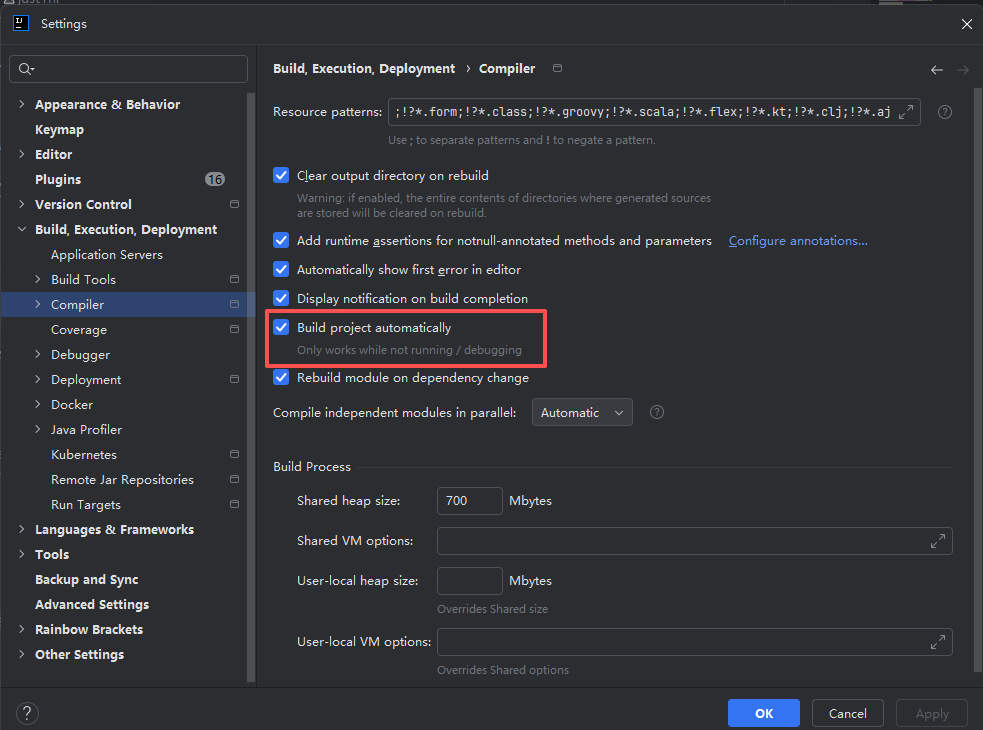 <dependency> <groupId>org.springframework.boot</groupId> <artifactId>spring-boot-devtools</artifactId> <scope>runtime</scope> <optional>true</optional> </dependency>2、idea 设置
