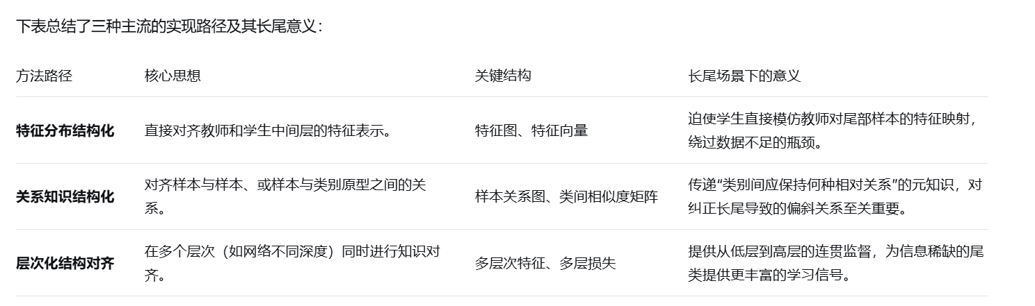 在长尾图像分类中,结构化知识蒸馏的核心思想是:它不仅让学生模型模仿教师模型的最终输出(标签),更重要的是模仿其内部学到的结构化知识,例如特征空间的几何关系、类间相似性、数据分布的形状等。这对于长尾问题至关重要,因为尾类样本稀少,难以从数据中直接学习鲁棒特征,但一个预训练好的教师模型(即使在均衡数据上训练)其特征空间已蕴含了丰富的、可迁移的类别间结构化关系。
