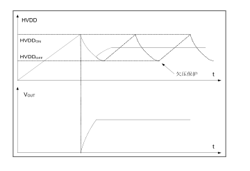 当开关电源启动后,C2电容上的电压会通过芯片内部的高压启动MOS管向芯片HVDD电容C3充电,当C3电容电压达到 11.5V,内部高压启动MOS管关闭,同时PWM开启,系统开始工作。