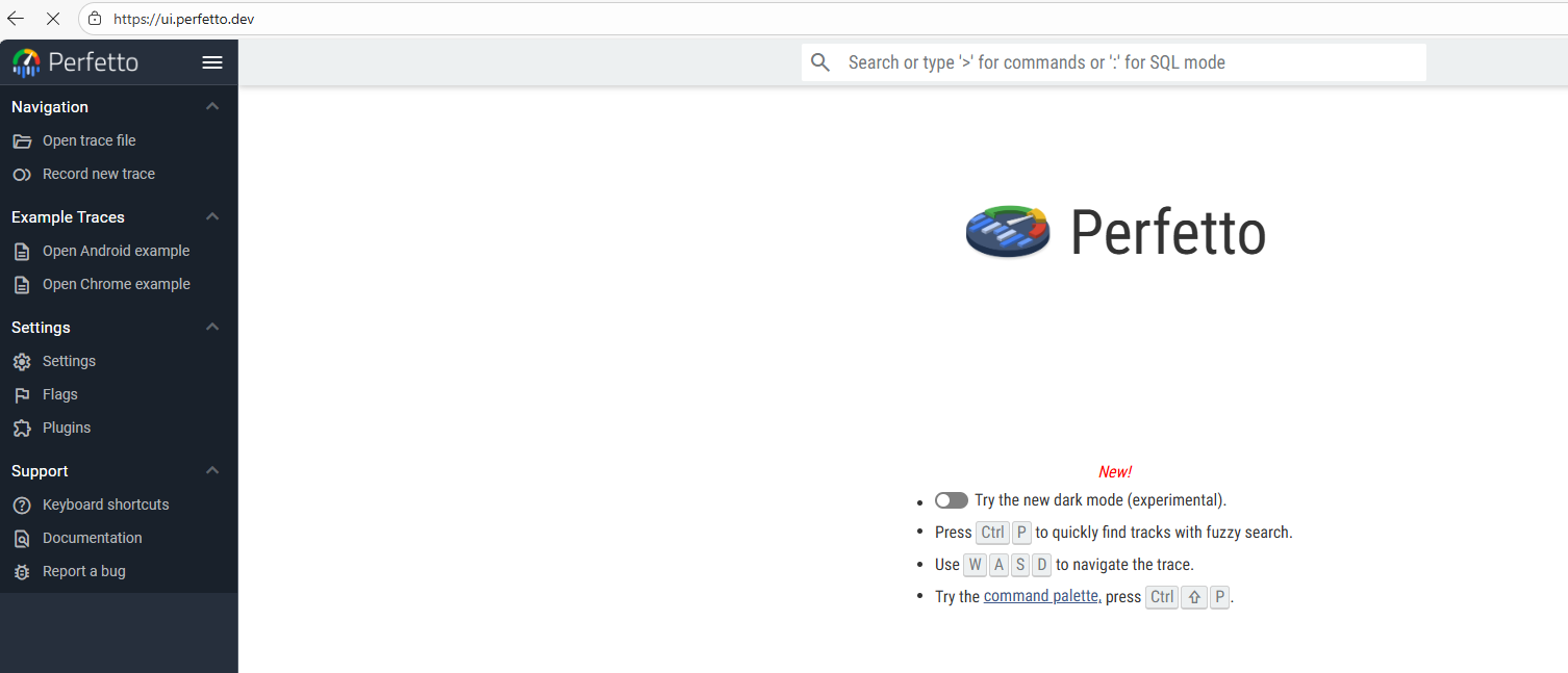 - 打开 Perfetto 官方分析 UI:https://ui.perfetto.dev/