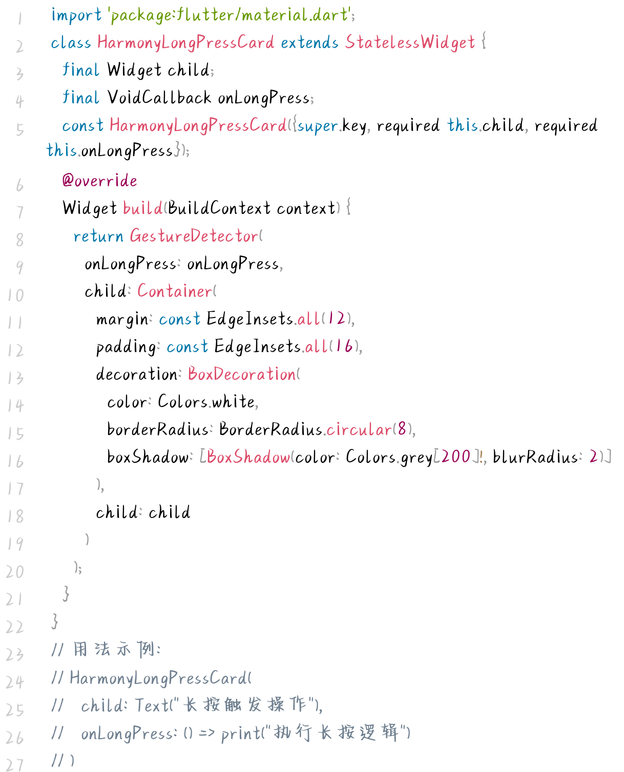 实现带长按反馈的卡片组件,适配需要长按操作的场景(如删除、编辑),贴合鸿蒙交互反馈逻辑,样式简约统一。