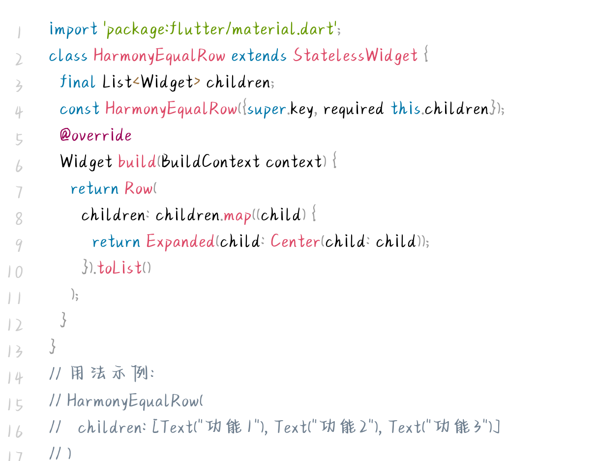 实现子组件横向均分排列,自动分配屏幕空间,适配功能按钮组、导航栏等场景,无需手动调整间距与宽度。