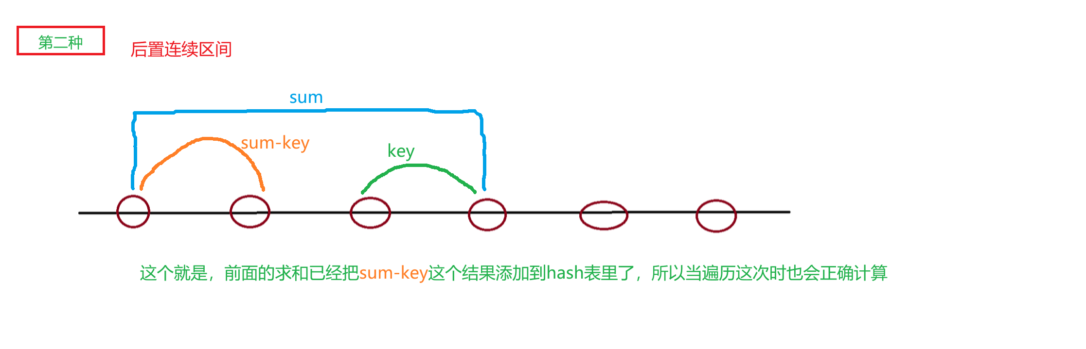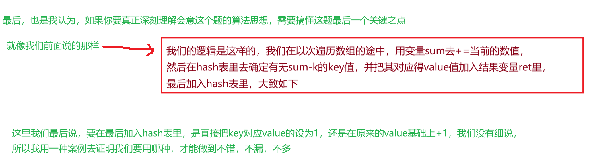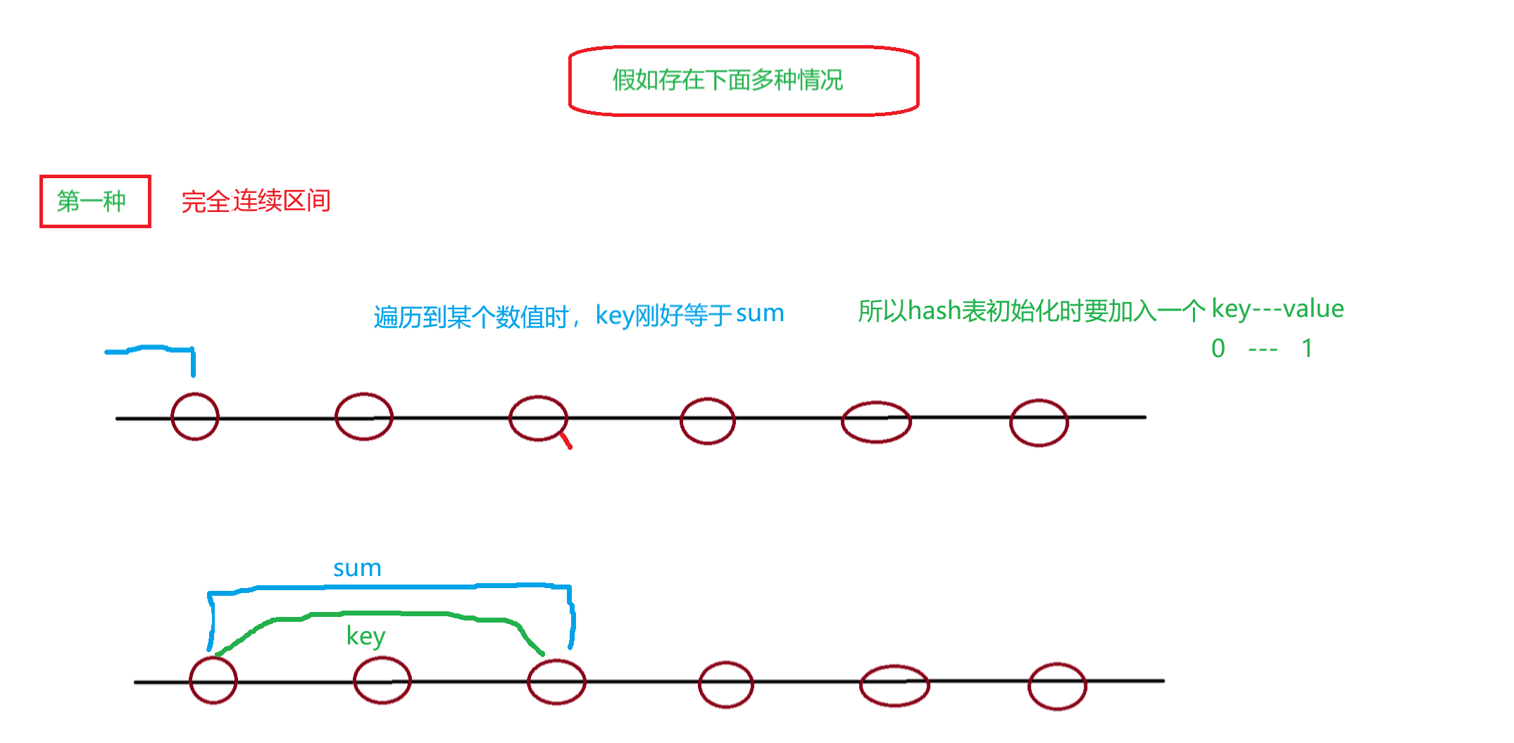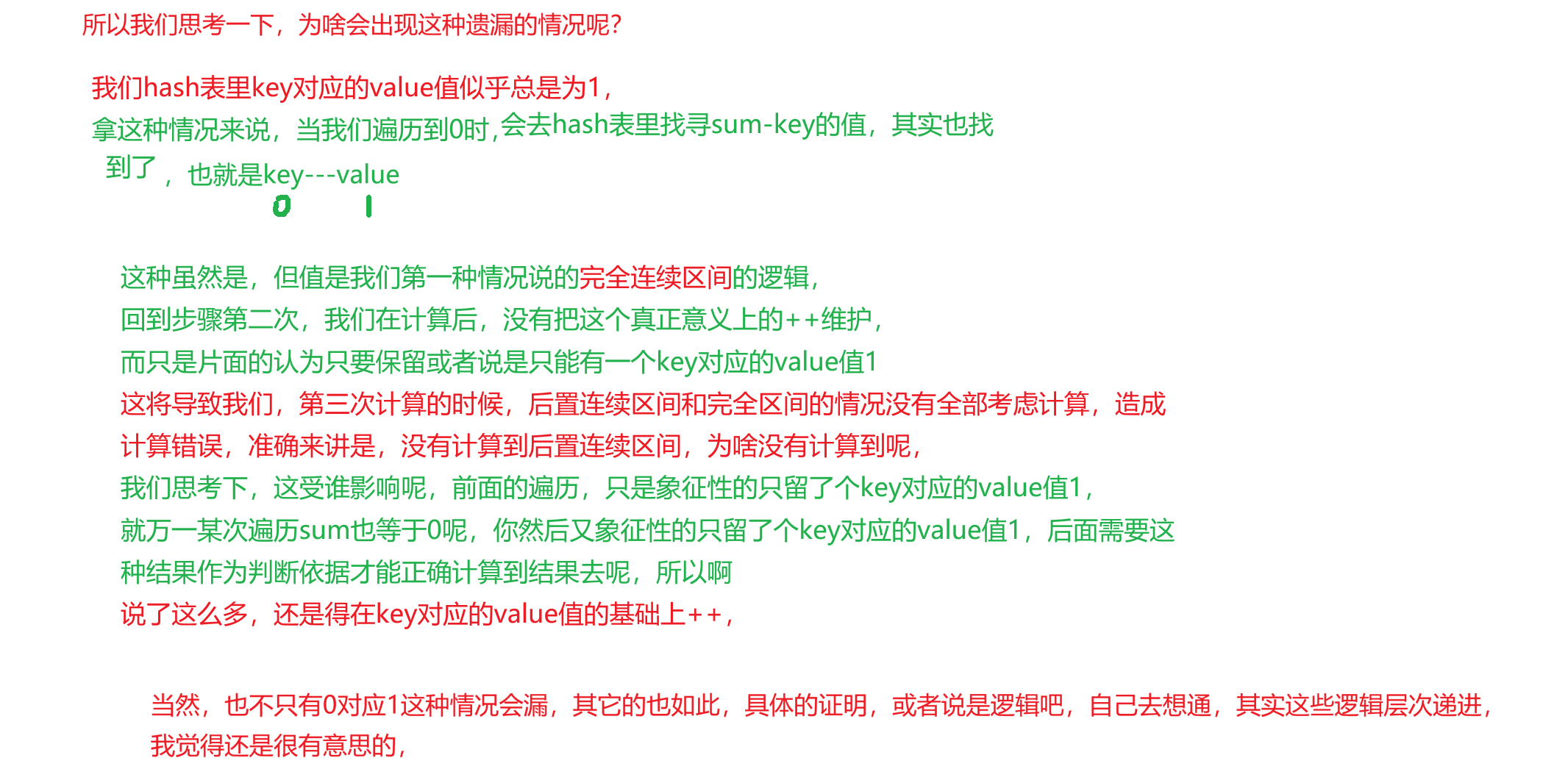 hash.put(0,1);//这是个完全连续区间等于key的情况,需要最先添加,因为如果没添加时,遍历第一个数时,hash表里是没有完全连续区间等于key的情况判断的,所不会计入ret结果