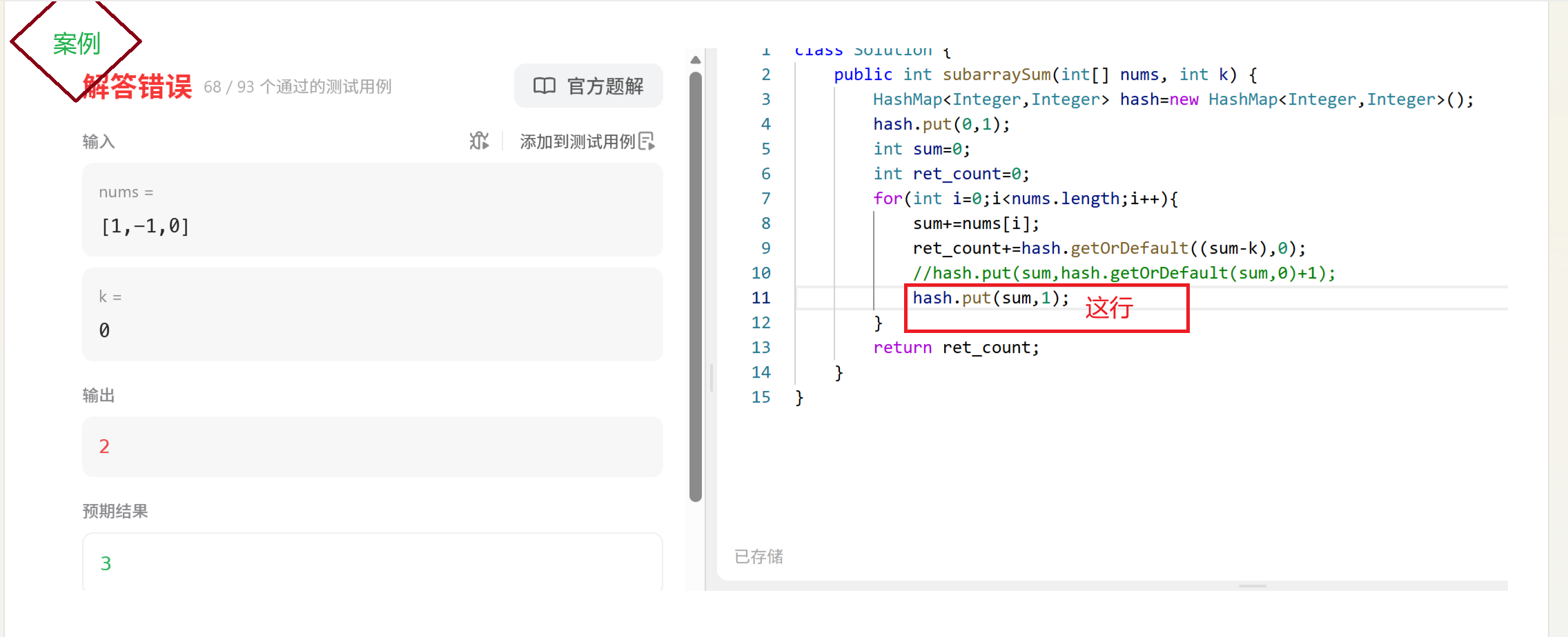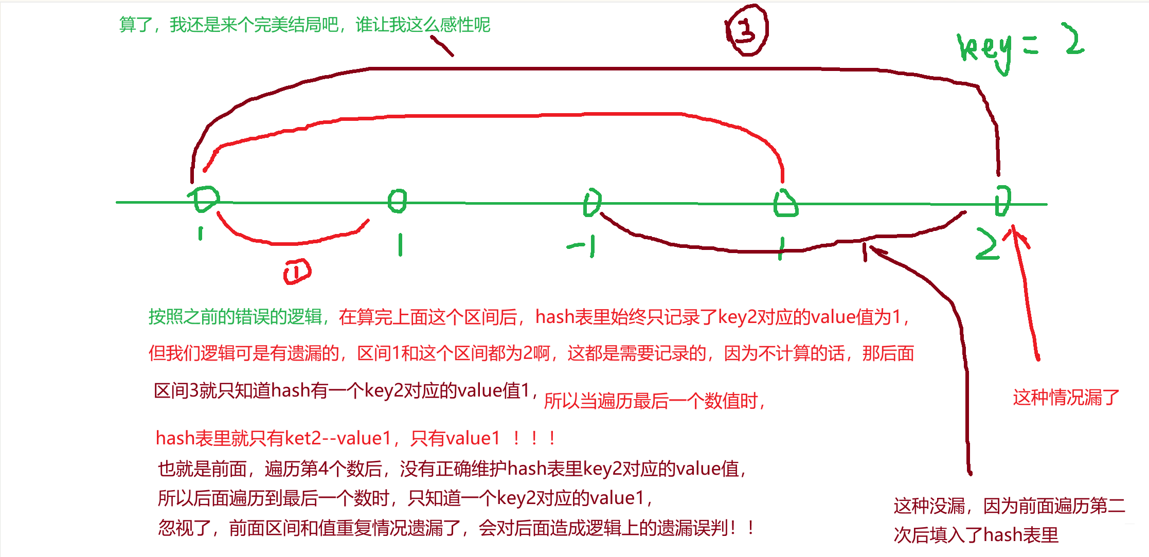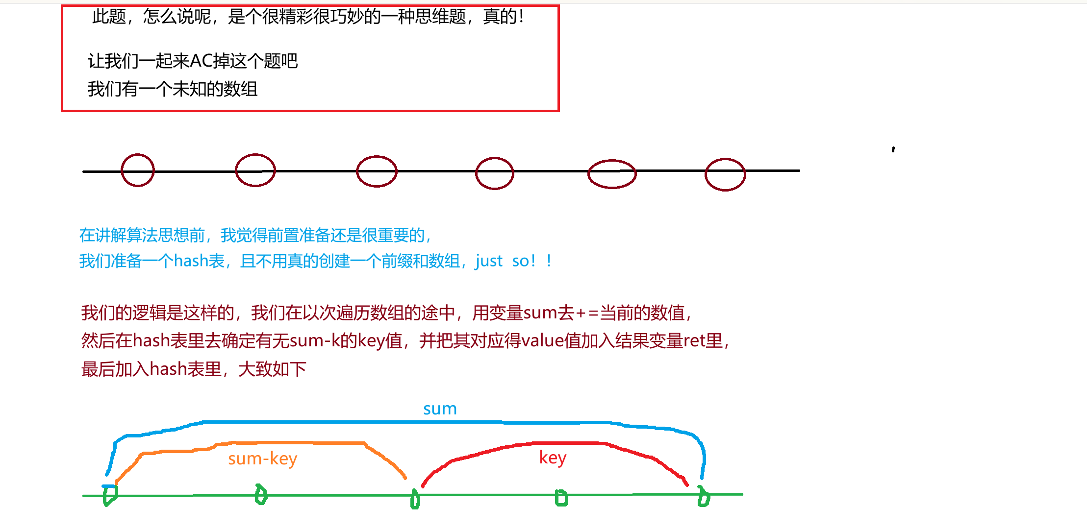 hash.put(0,1);//这是个完全连续区间等于key的情况,需要最先添加,因为如果没添加时,遍历第一个数时,hash表里是没有完全连续区间等于key的情况判断的,所不会计入ret结果