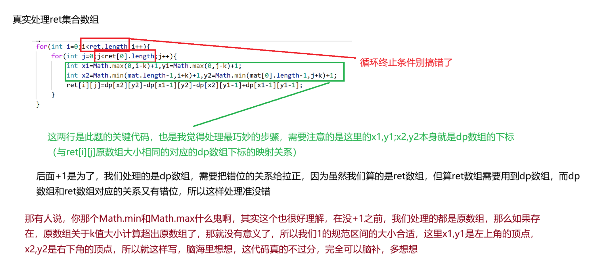 int x2=Math.min(mat.length-1,i+k)+1,y2=Math.min(mat[0].length-1,j+k)+1;//不能超过右下角区间范围