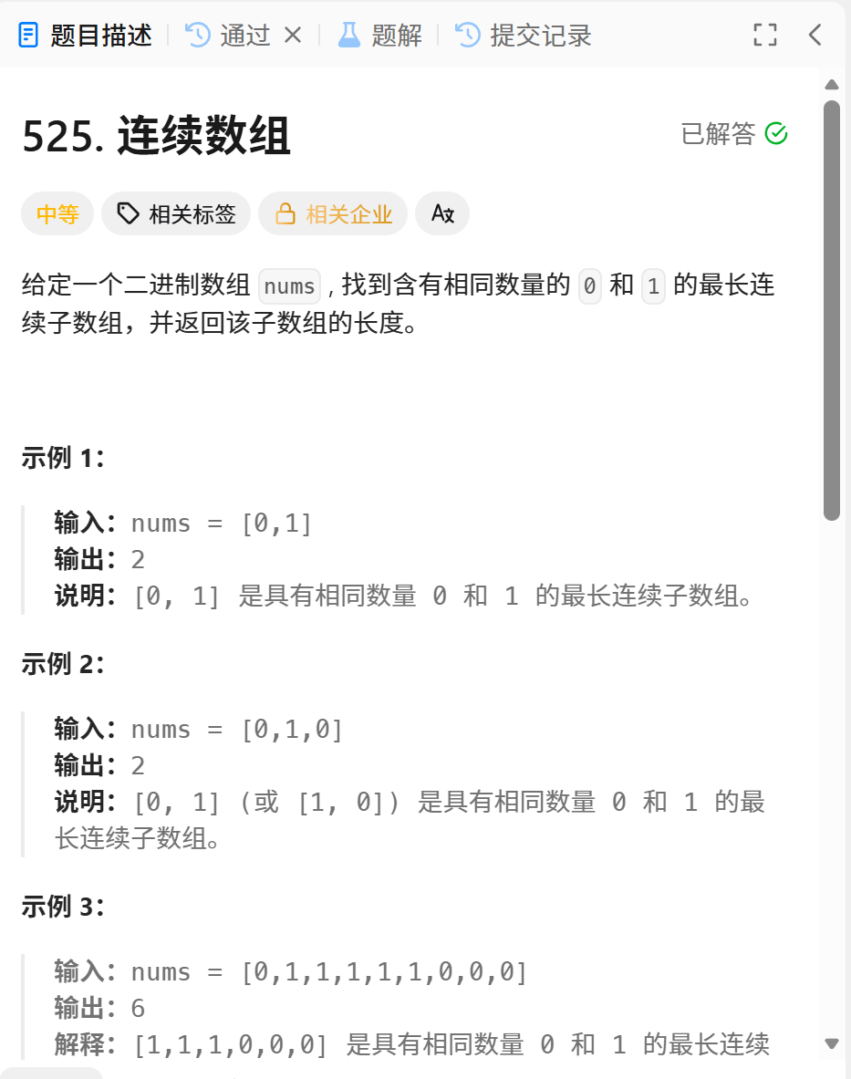 ret=Math.max(ret,i-hash.get(sum));//更新结果,不必加入hash表,因为第一次已经出现