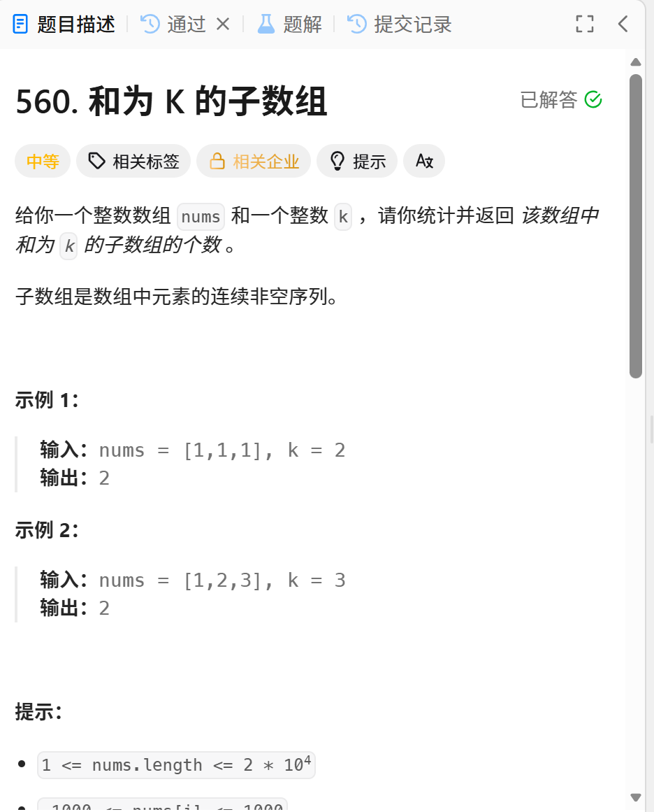 https://leetcode.cn/problems/subarray-sum-equals-k/?envType=problem-list-v2&envId=2cktkvj
