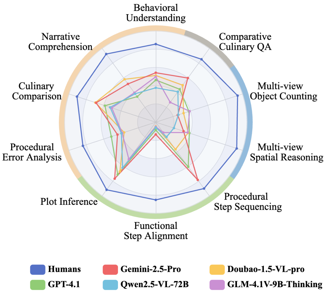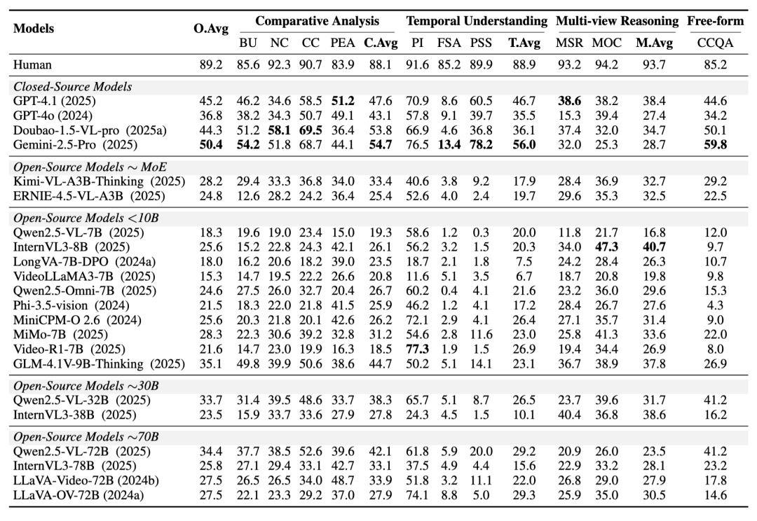 - 时空推理短板明显: 在"多视角推理"和"时序理解"任务上,模型与人类的差距尤为巨大。例如在动作对齐任务中,人类准确率为 85.2%,而最强模型仅为 13.4%。