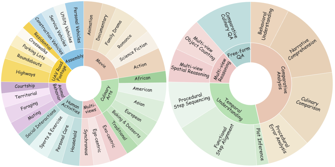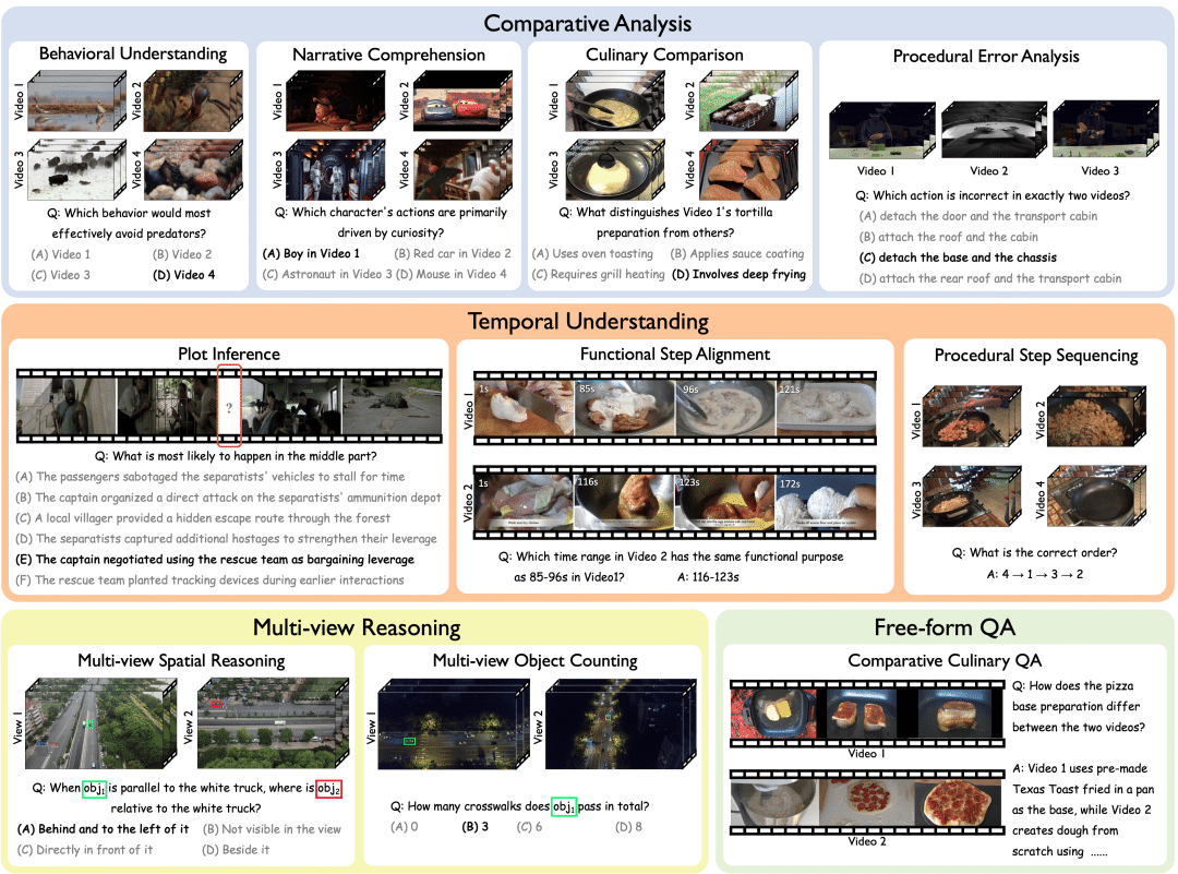 - 任务层级丰富: 设立了 4 个高层维度 (对比分析、时序理解、多视角推理、自由问答)和 10 项具体任务(如行为理解、叙事理解、烹饪对比、多视角计数等)。