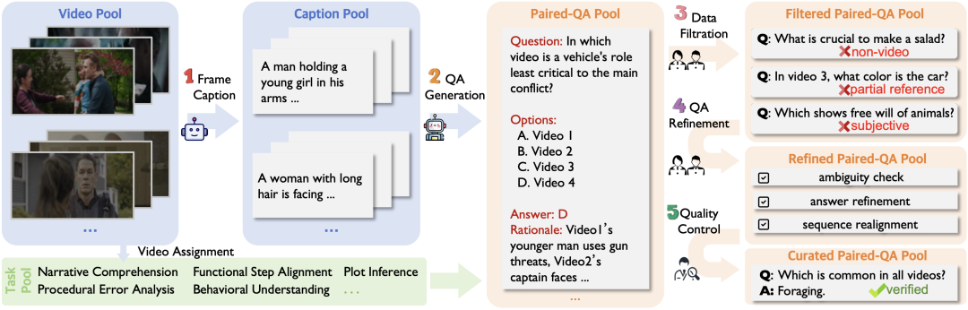 - 粗筛(Filtration): 剔除那些"只看一个视频就能回答"的简单问题,确保所有题目都必须结合多个视频才能解出。