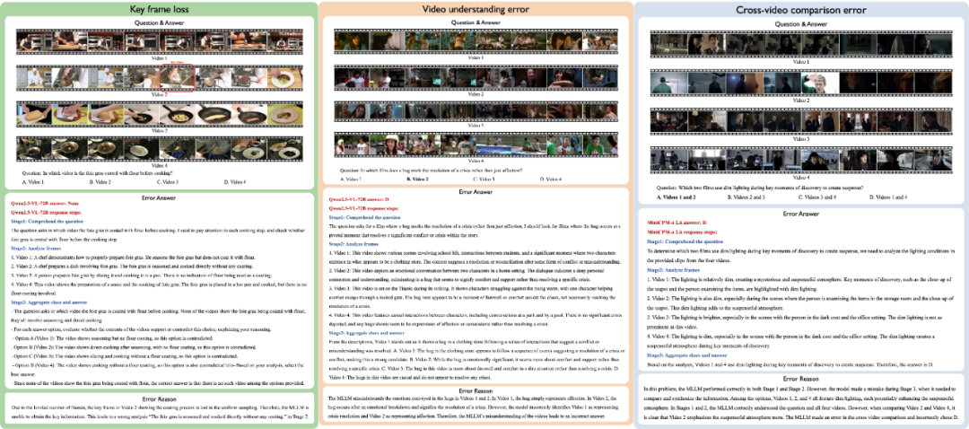 - **视频理解错误(Video understanding error):**模型对某个单独的视频理解出现偏差,导致在进行跨视频信息整合时出现错误。