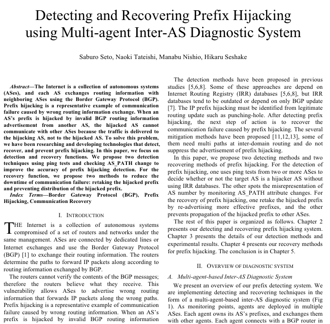 文献来源于:Detecting and Recovering Prefix Hijacking using Multi-agent Inter-AS Diagnostic System